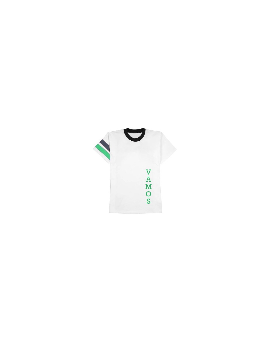 Camiseta blanca con cuello a contraste y vivo en mangas. Algodón 100% o mezcla. Múltiples combinaciones posibles. Escudo bordado o serigrafía. Se puede añadir o quitar los complementos que se deseen, se confecciona a medida de los colegios. Tallas desde la 2 hasta la 3XL.