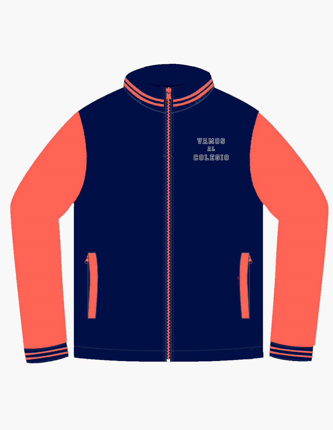Chaqueta tipo baseball en felpa con mangas a contraste y vivos en el cuello y los puños. Se puede añadir o quitar los complementos que se deseen, se confecciona a medida de los colegios. Tallas desde la 2 hasta la 3XL.