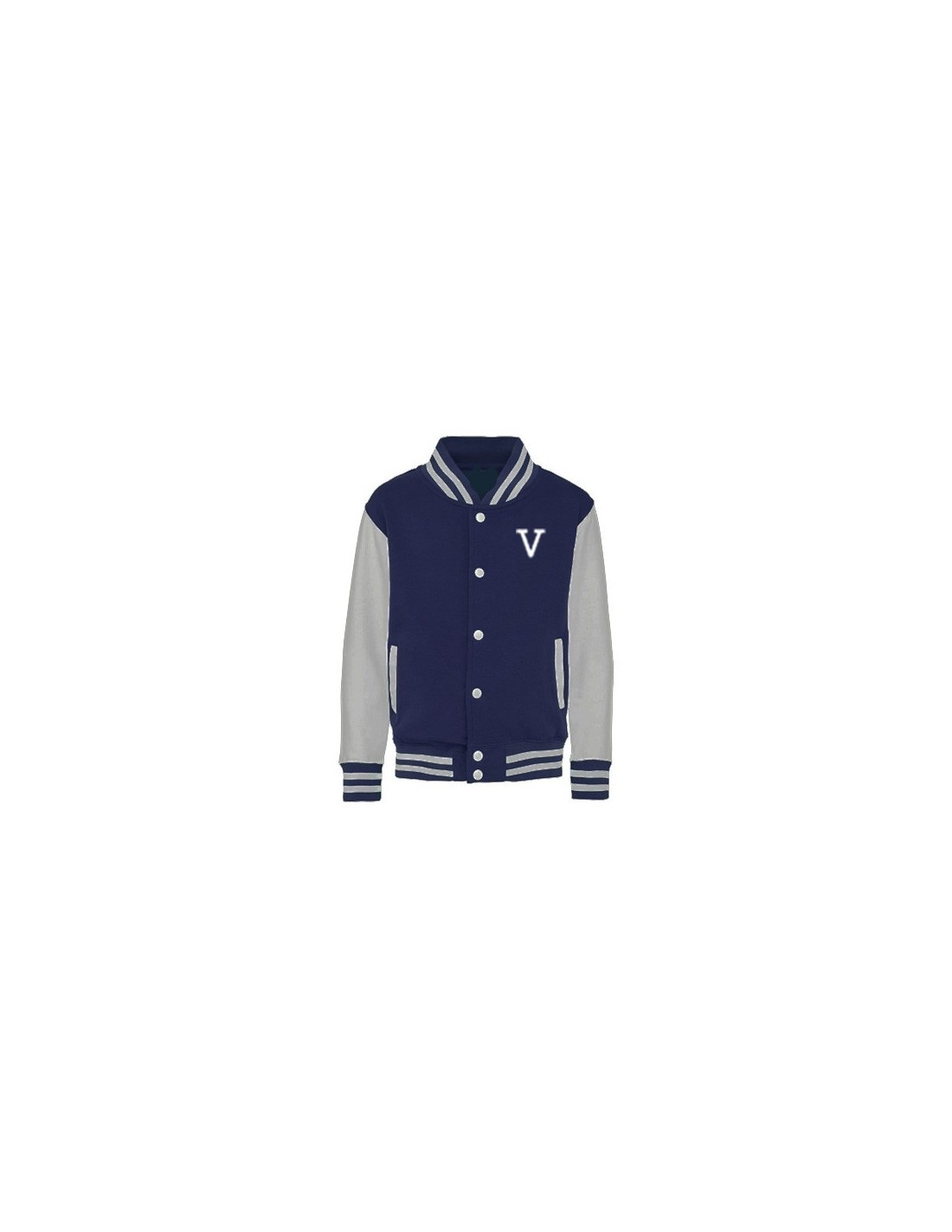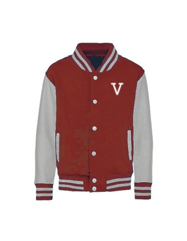 Chaqueta en felpa estilo baseball. Manga a contraste. Puños y cintura con vivos. Serigrafía o bordado al pecho y en espalda. Se puede confeccionar en algodón, poliéster o mezclas. Se puede añadir o quitar los complementos que se deseen como vivos en las mangas, en los puños, hilado de colores, etc. Se confecciona a medida de los colegios. Tallas desde la 2 hasta la 3XL.
