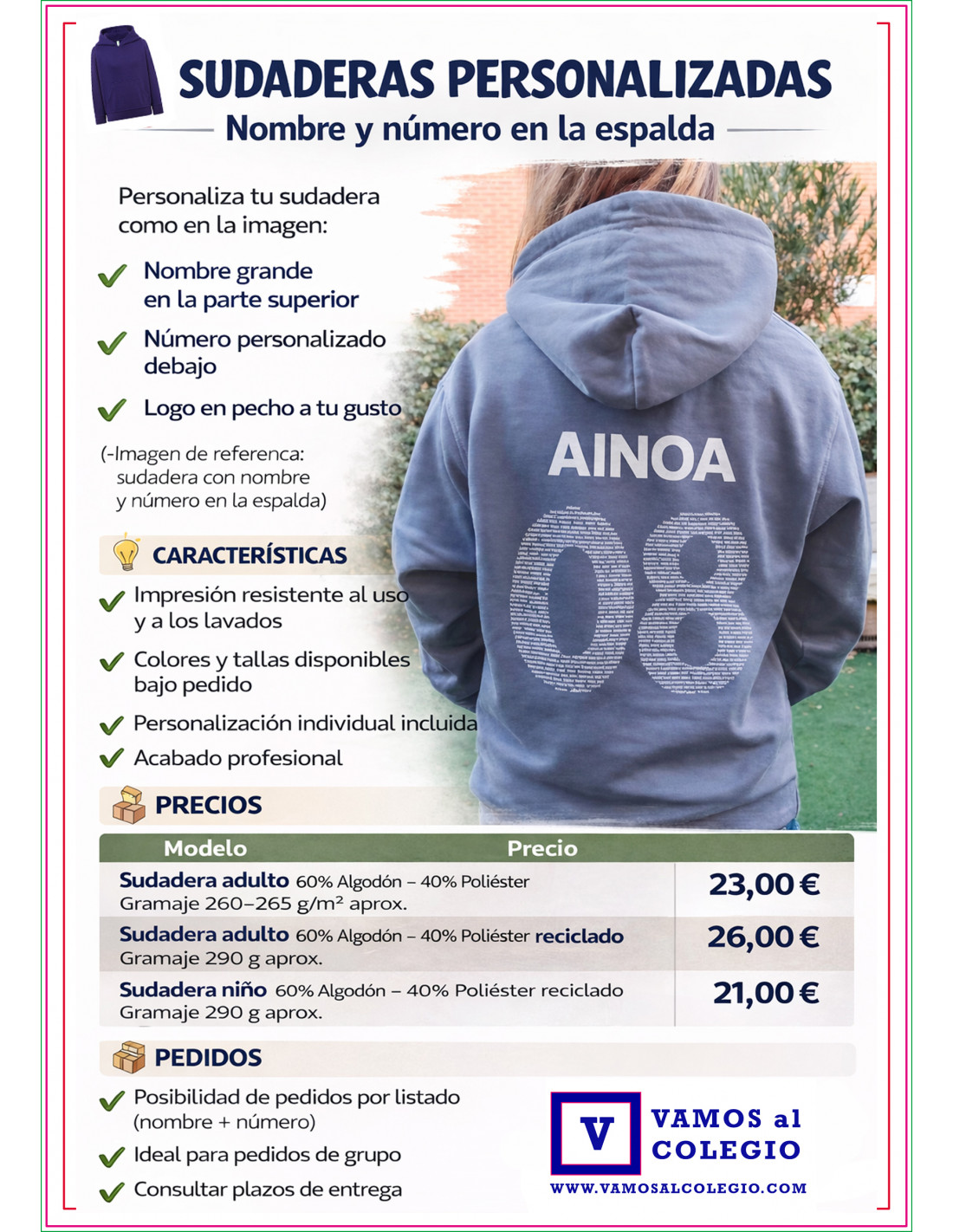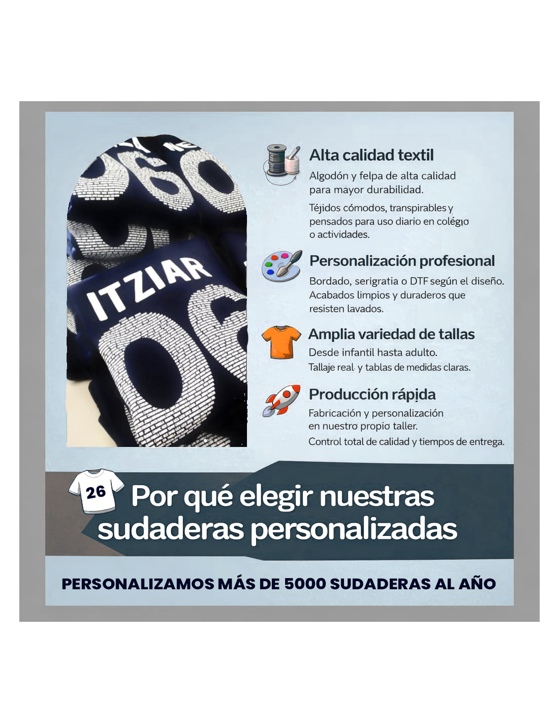 Sudaderas con escudo en el pecho y números de graduación o año en la espalda. Disponibles en múltiples colores y calidades. Puedes añadir nombre del alumno y bandera en la manga. ¡Todo a tu gusto!